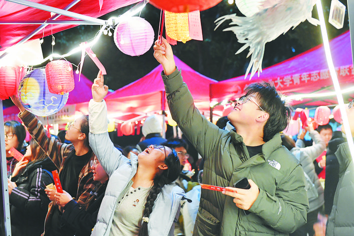 12月12日晚,合肥工业大学翡翠湖校区,学生们驻足欣赏各色彩灯。当日,合肥工业大学第23届元宵节暨彩灯设计展游园会拉开帷幕。本次活动以“光体现美与美的八个层次,万盏工业彩灯照亮初心”为主题,设有“校庆主题”、“传统文化”、“跨界创意”三个赛道。共征集作品200余幅,吸引了众多师生的热情参与。记者郭如琪、实习生翁淑荣摄